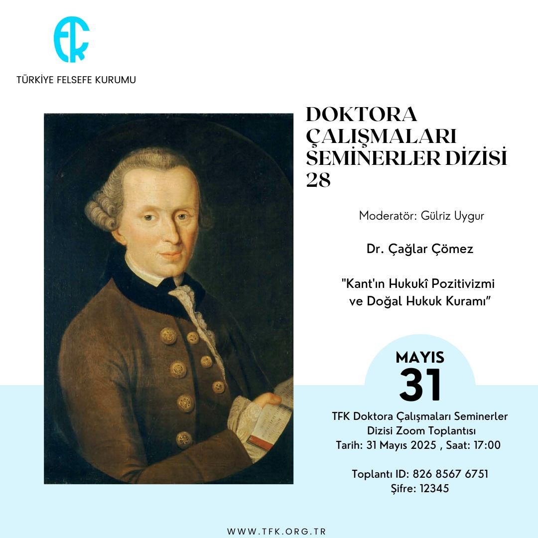 "Doktora Çalışmaları Seminerleri" dizisinin yirmi sekizincisi, 31 Mayıs 2025, Cumartesi günü, saat 17:00'de, Prof. Dr. Gülriz Uygur'un moderatörlüğünde, Dr. Çağlar Çömez'in "Kant'ın Hukukî Pozitivizmi ve Doğal Hukuk Kavramı" başlıklı konuşmasıyla gerçekleştirilecektir.