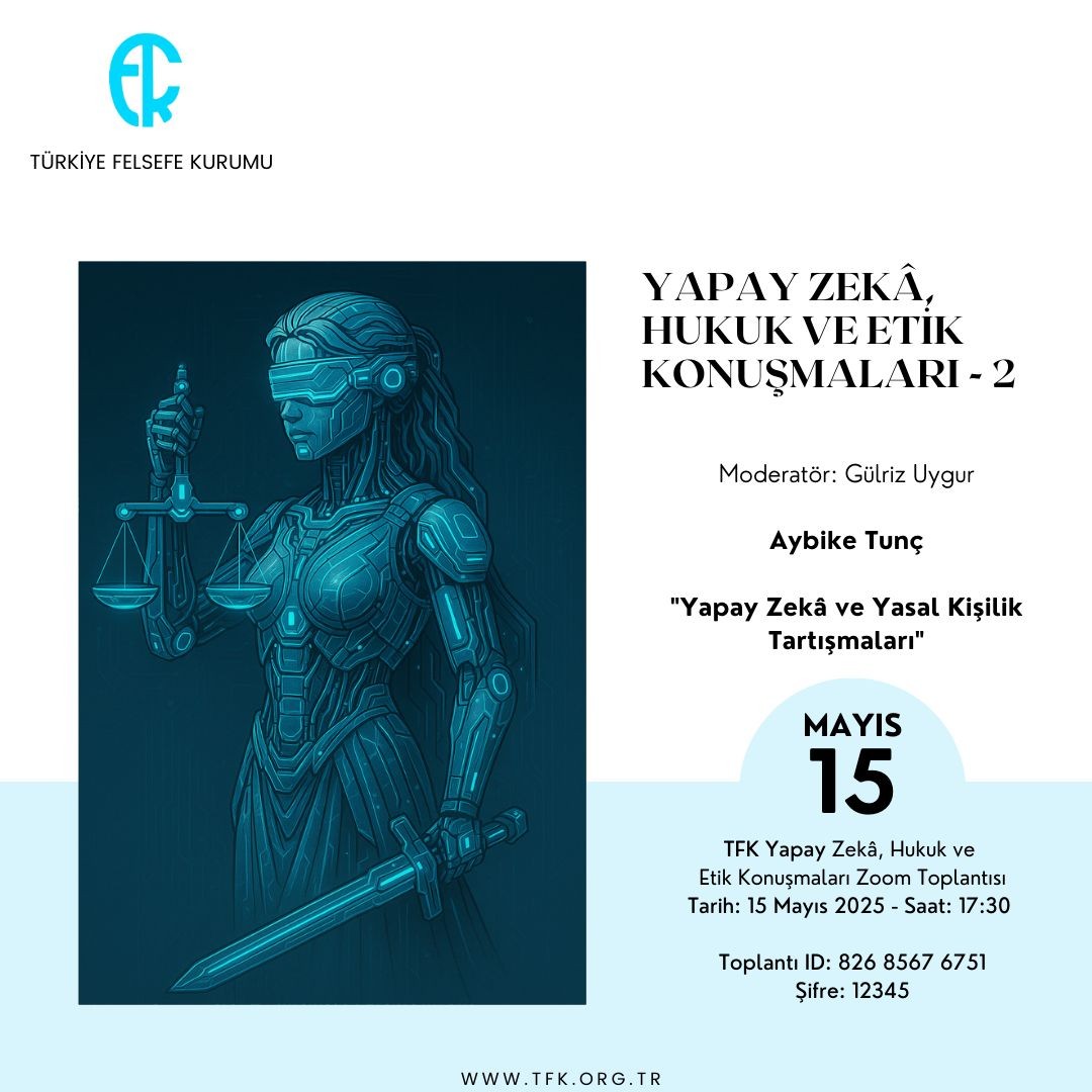 Hukuk Felsefesi Birimimiz tarafından "Hukuk Felsefesi Alanındaki Son Çalışmalar Dizisi" kapsamında düzenlenen "Yapay Zekâ, Hukuk ve Etik Konuşmaları"nın ikincisi, 15 Mayıs 2025, Perşembe günü, saat 17:30'da, Gülriz Uygur'un moderatörlüğünde, Aybike Tunç'un "Yapay Zekâ ve Yasal Kişilik Tartışmaları" başlıklı konuşmasıyla gerçekleştirilecektir.