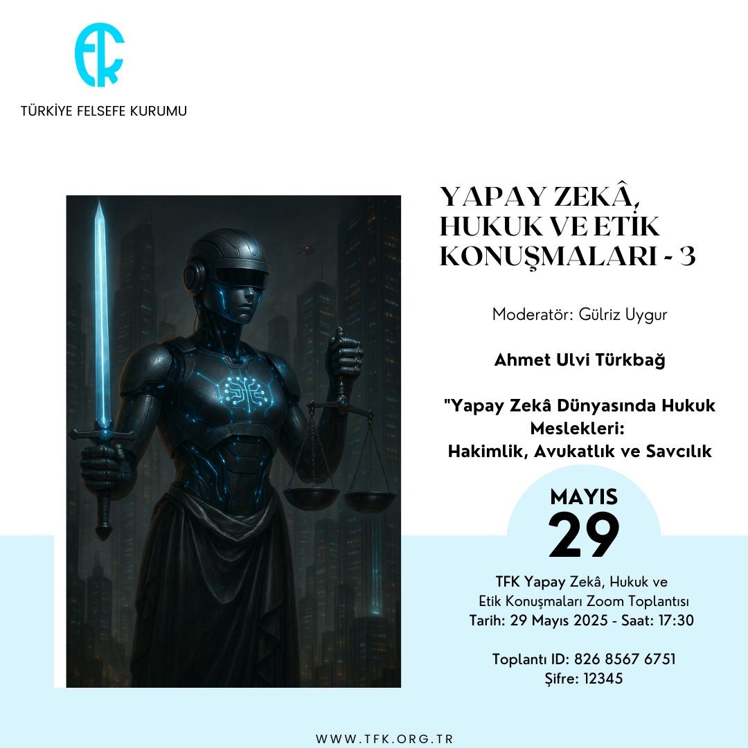 Hukuk Felsefesi Birimimiz tarafından "Hukuk Felsefesi Alanındaki Son Çalışmalar Dizisi" kapsamında düzenlenen "Yapay Zekâ, Hukuk ve Etik Konuşmaları"nın üçüncüsü, 29 Mayıs 2025, Perşembe günü, saat 17:30'da, Gülriz Uygur'un moderatörlüğünde, Ahmet Ulvi Türkbağ'ın "Yapay Zekâ Dünyasında Hukuk Meslekleri: Hakimlik, Avukatlık ve Savcılık" başlıklı konuşmasıyla gerçekleştirilecektir.